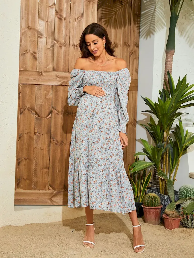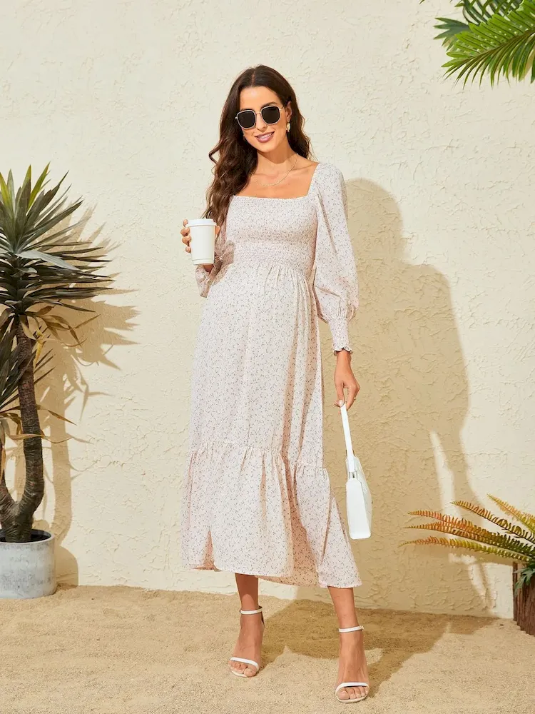 Pregnant Women Fashion Casual Chiffon Floral Printed Ruffled Long-Sleeve Dress