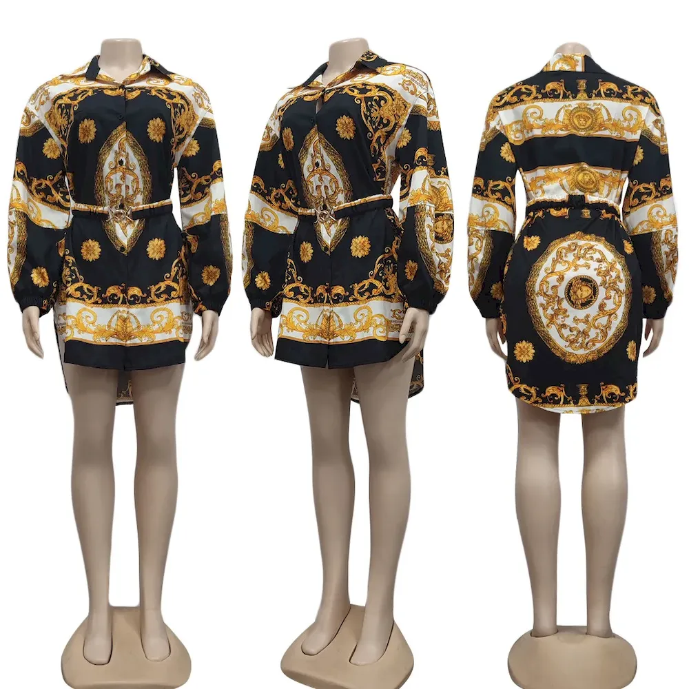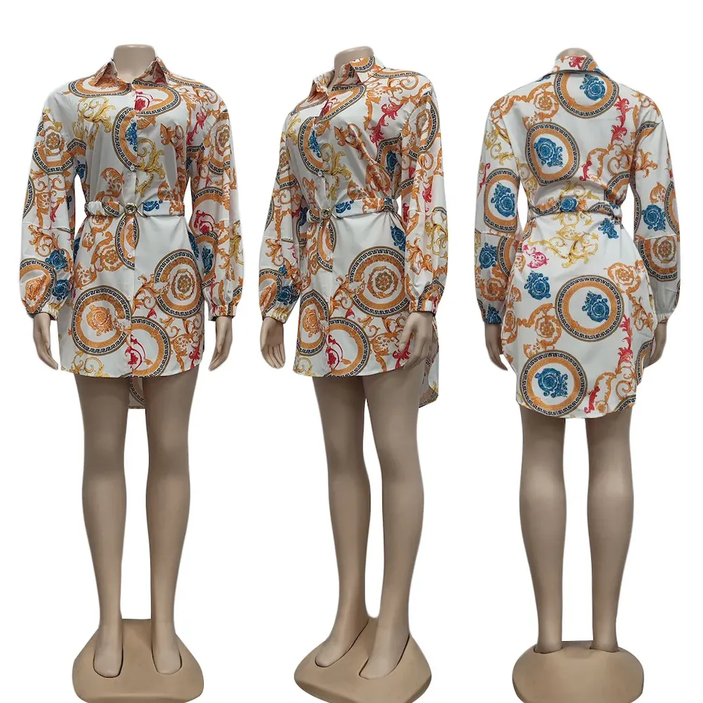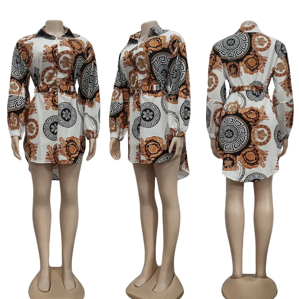 Women Fashion Casual Printed Lapel Long-Sleeve Belt Dress