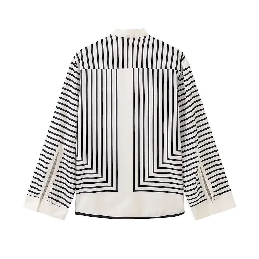 Women Fashion Casual Stripe Color Contrast Round Neck Single-Breasted Long-Sleeve Loose Blouse