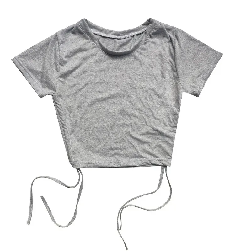 Women Fashion Sexy Solid Color Short-Sleeve Drawstring Tight Crop Top